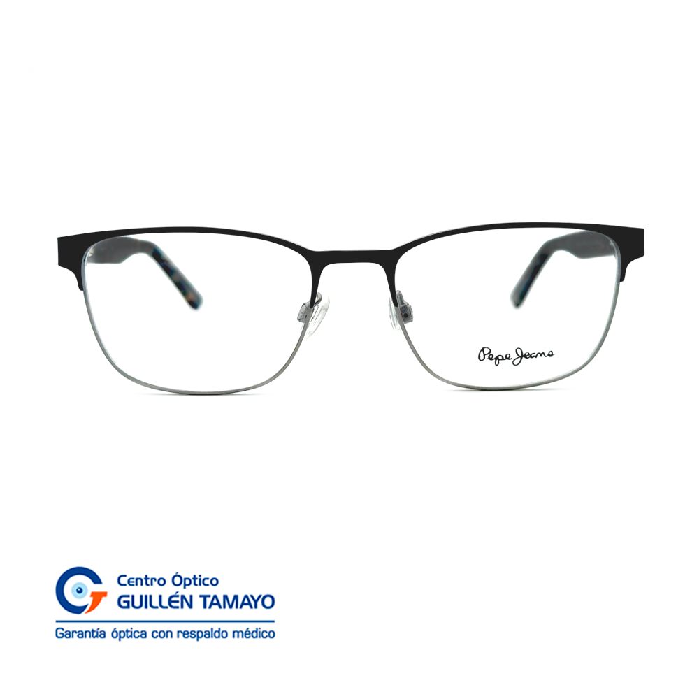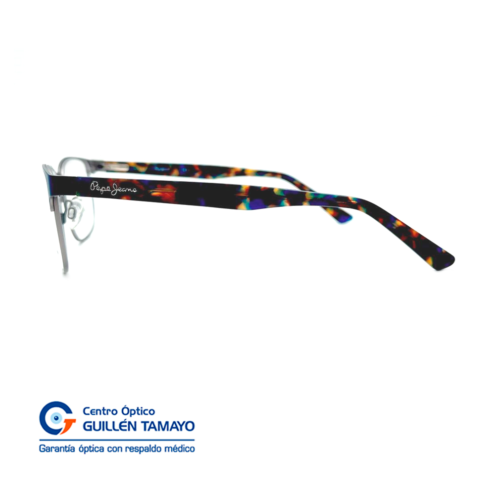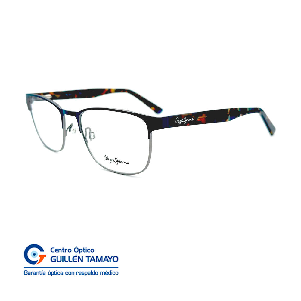 Frente De Montura Color Azul Con Varillas De Acetato Marmoleadas Y Detalle De Figuras Geometricas